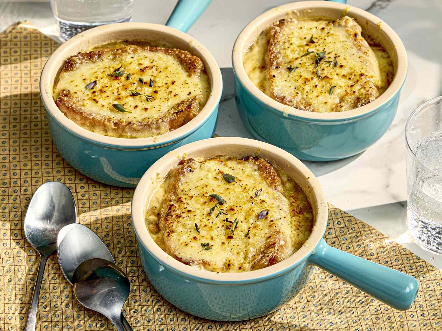 Последний штрих – хлеб под сырной шапкой. Используйте ломтики французского хлеба, вырезанные так, чтобы они плотно помещались в миски (около 1,25 см толщиной), и поджарьте их до хрустящей корочки, чтобы предотвратить распад. Смажьте маслом и натрите сырым чесноком для дополнительного аромата. Поверх каждой миски выложите щедрую ½ чашки тертого грюйера перед запеканием до расплавления и появления пузырей.