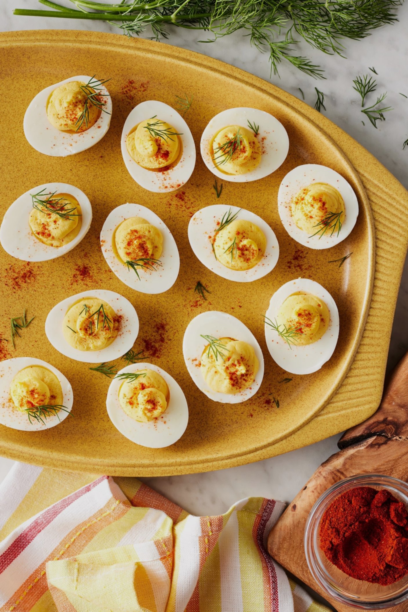 - Зберіть та прикрасьте: Наповніть білки яєць жовтковою сумішшю. Посипте паприкою, цибулею-різанцем або кропом перед подачею.
